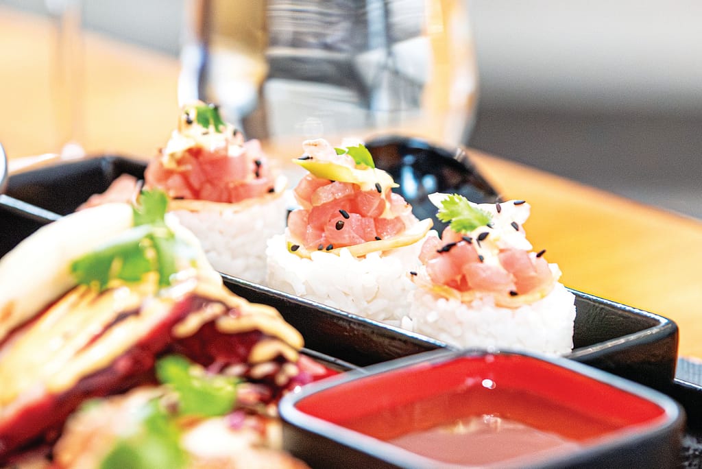 Options include the Mr Chang, featuring prawn tempura, avocado, cucumber, spicy mayonnaise and crispy crumb; the Legend with crab, roasted red pepper, Japanese mayonnaise and smoked caviar; East “Meats” West with bacon, beef sirloin and cheese wrapped in potato strings; Teriyaki with chicken, avocado and teriyaki sauce; Teriyaki Tofu with carrot, sweet pepper and cucumber; Tuna Poke with cucumber, radish and spicy mayo; and Salmon Sashimi, served as thinly sliced salmon with traditional condiments.