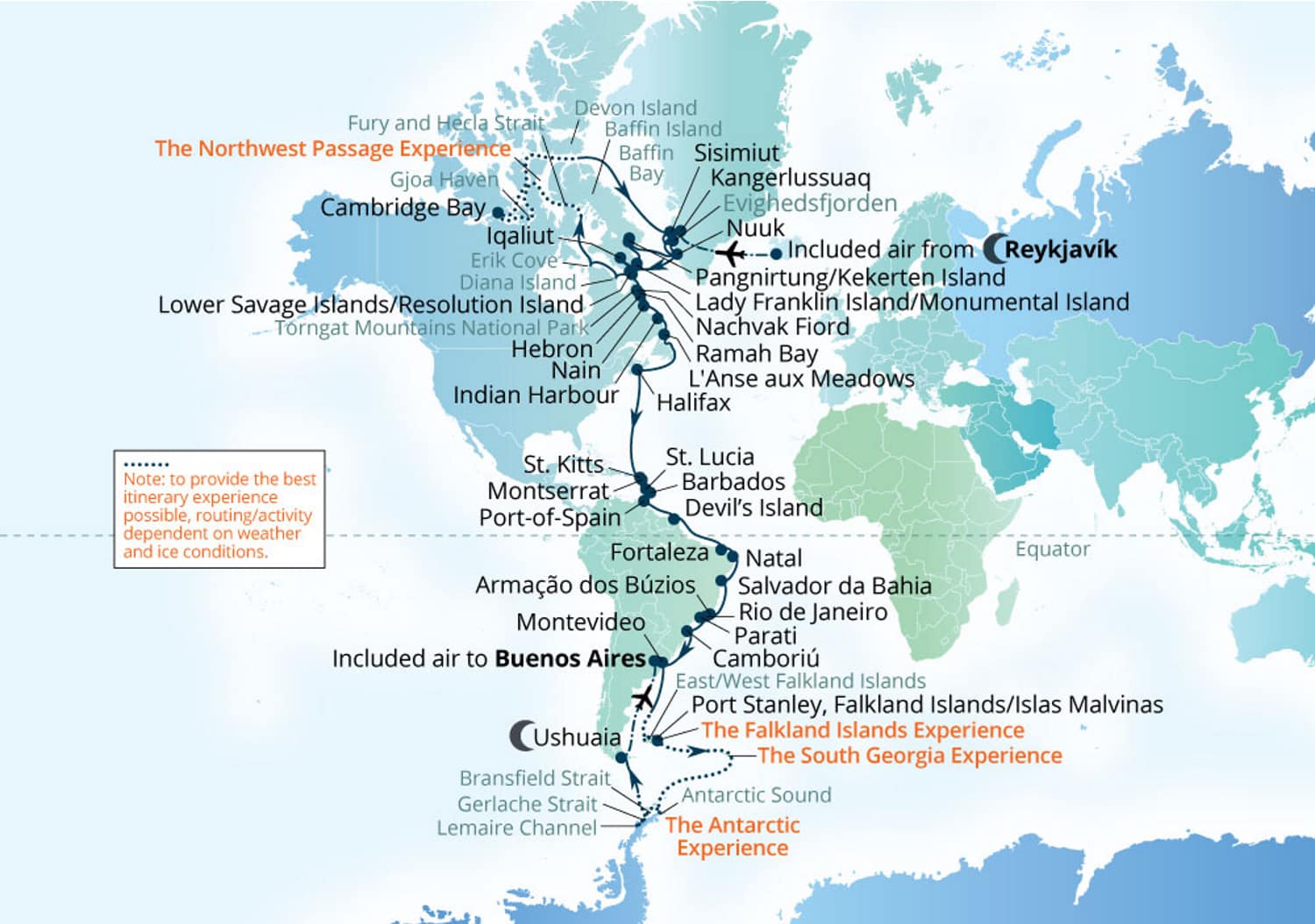 The 94-day voyage begins with an overnight stay in Reykjavik, Iceland, followed by a charter flight to Kangerlussuaq, Greenland, where guests will embark the ship.